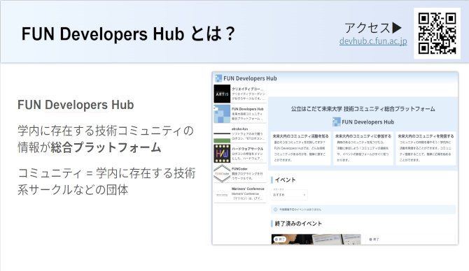 未来大内には多くの技術系コミュニティが存在していますが、それぞれの情報が分散しており、活動内容やイベント情報を把握しづらいという課題があります。FUN Developers Hubは、こうした現状を改善するため、技術系コミュニティ向けの総合プラットフォームを運営しています。各コミュニティの紹介やイベント情報を集約し、必要な情報にアクセスしやすい環境を提供しています。今年度は新機能の実装に加え、昨年度の議論を踏まえたデザインの刷新も予定しています。