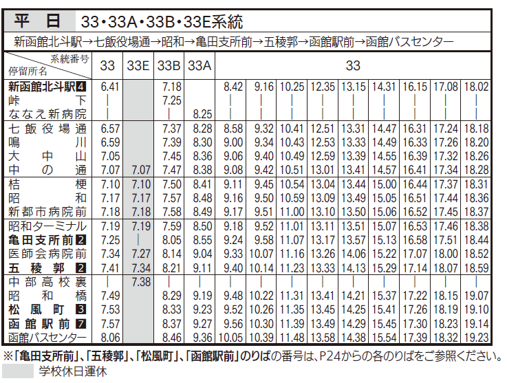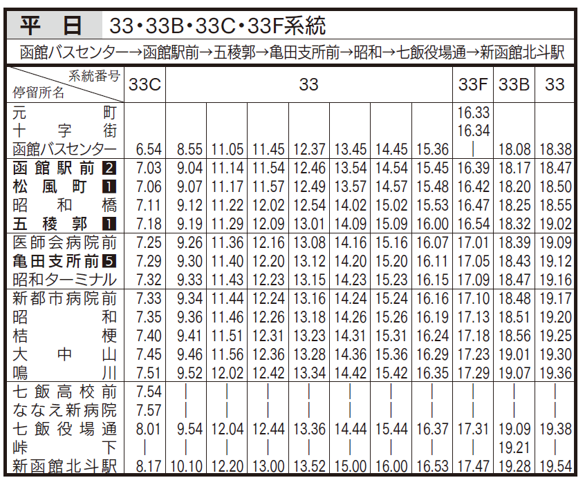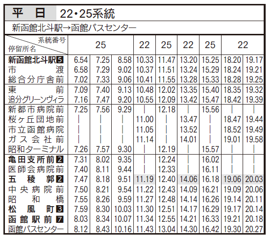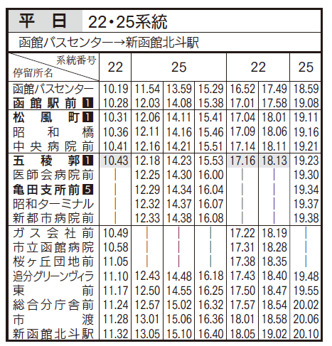 平日ダイヤ(亀田支所、五稜郭、函館駅前行き)