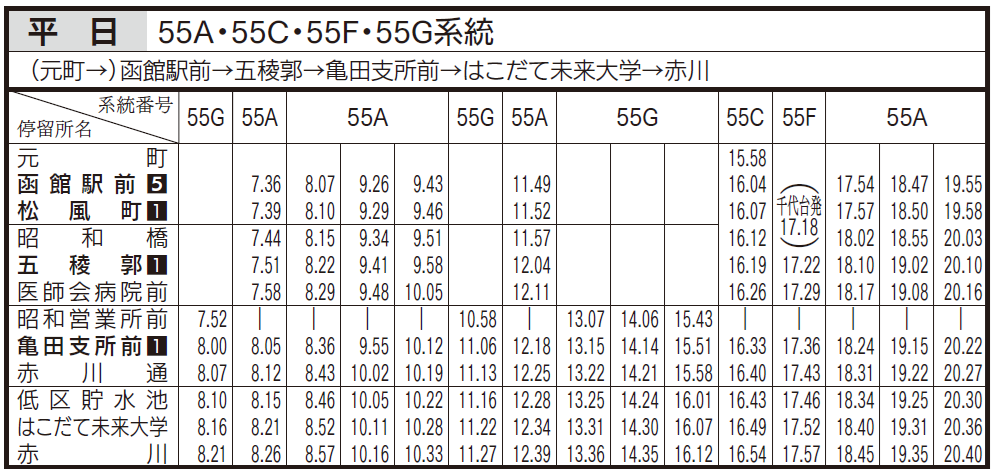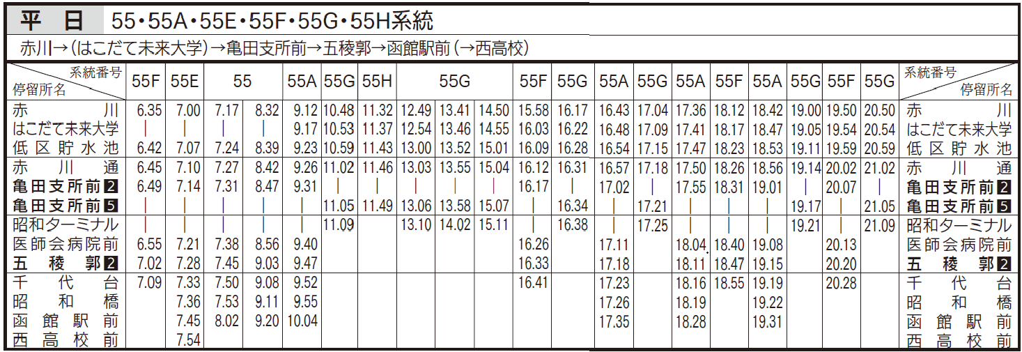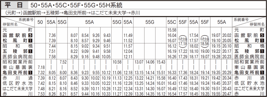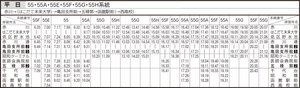 平日ダイヤ(亀田支所、五稜郭、函館駅前行き)