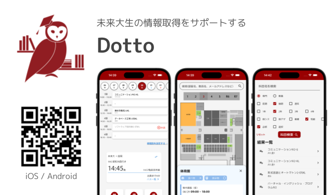 本プロジェクトでは、未来大生を支援するモバイルアプリ「Dotto」の開発・運用を行っています。Dottoは、未来大に関する分散していて見つけにくい情報や取得しにくい情報をまとめることで、学生生活を支援することを目的としています。昨年度に、iOSと Androidの両プラットフォームでリリース済みです。前期ではアプリ開発の基礎を学び、後期から未来大生にとってニーズの高い機能を優先して開発しています。また、開発する楽しさを知ることにも重点を置いているため新たな挑戦も進んで行っていきます。