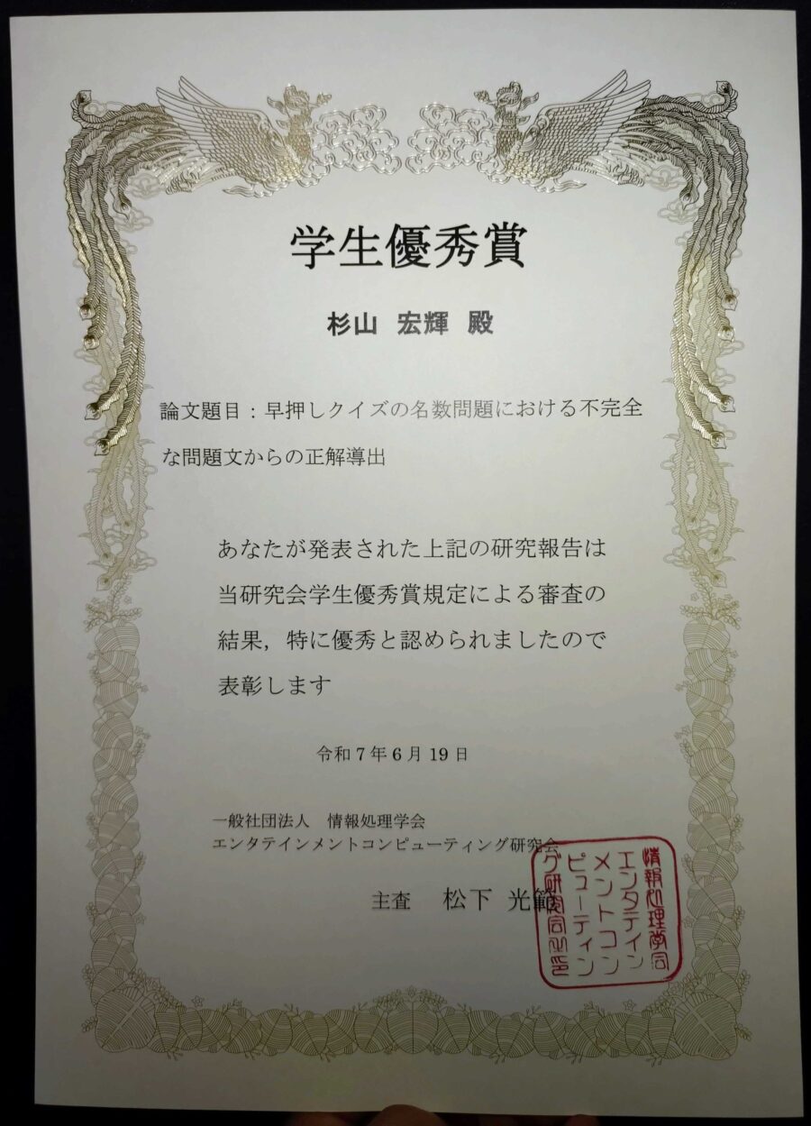 博士(前期)課程修了の杉山宏輝さんが情報処理学会エンタテインメントコンピューティング研究会の2024年度学生優秀賞を受賞