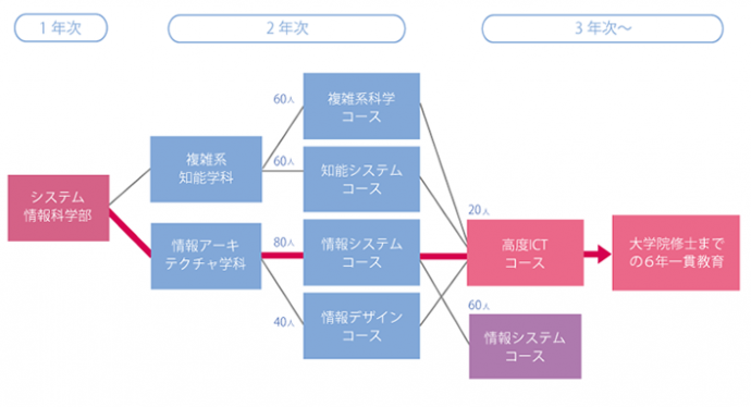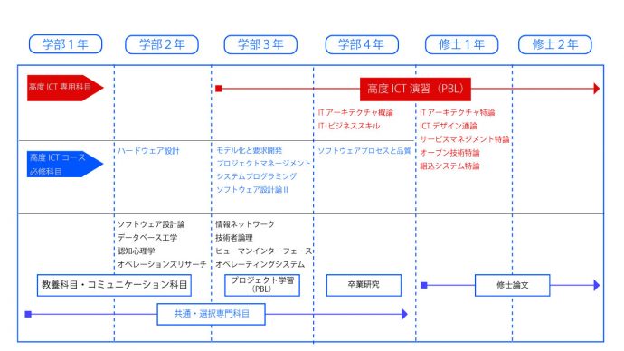 高度ICT(Information and Communication Technology、高度な情報通信技術)コースは、情報システムコースの3年次において2年間の大学院(博士前期課程)進学を前提に選ぶ、大学生活を6年一貫でとらえたコースです。
