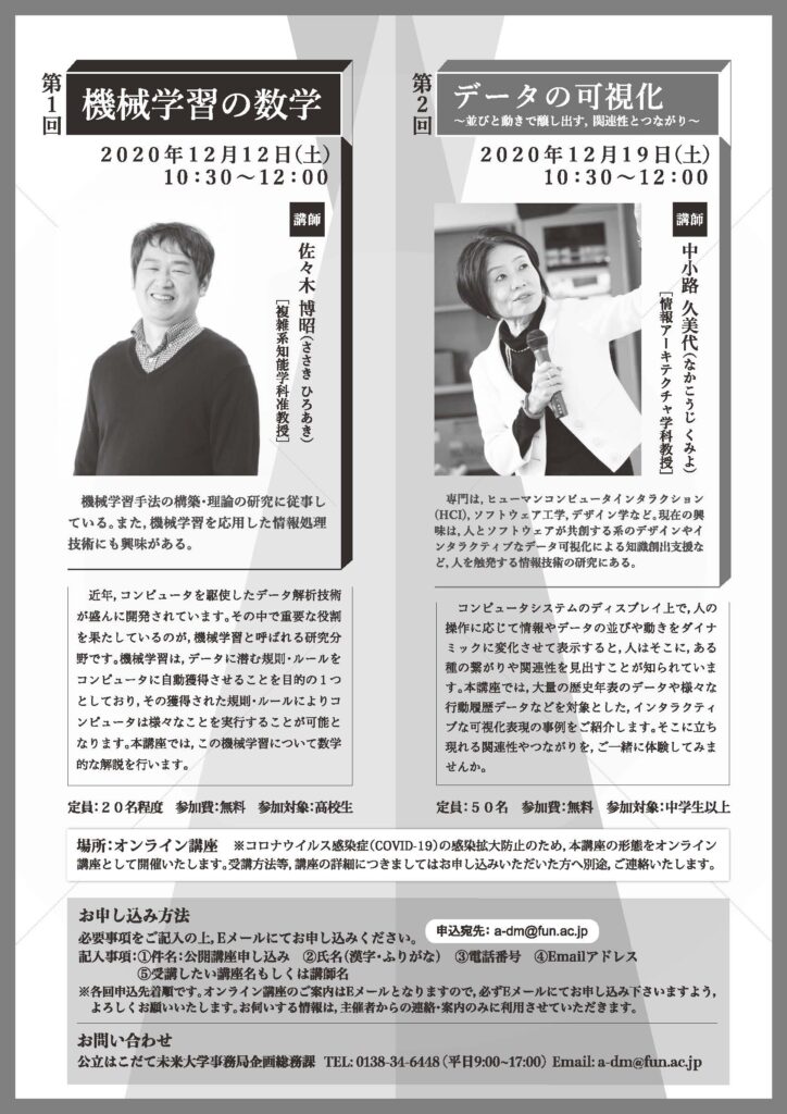 | 講師 | 佐々木 博昭(公立はこだて未来大学 複雑系知能学科 准教授) 機械学習手法の構築・理論の研究に従事している。 また、機械学習を応用した情報処理技術にも興味がある。 |
