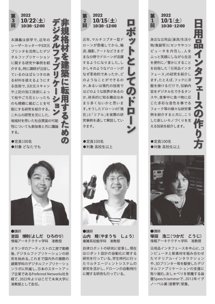 | 講師 | 吉田 博則(よしだ ひろのり) 情報アーキテクチャ学科 准教授 オランダのアーティストの工房で勤務後、デジタルファブリケーションの研究を始める。これまで国内外の複数の建築学科のデジタルファブリケーションラボに所属し、日本のスタートアップ企業であるPreferred Networks社を経て、2022年よりはこだて未来大学に准教授として赴任。 |