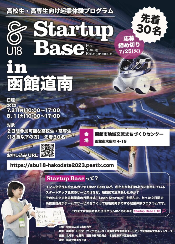 本学主催による「高校生・高専生向け起業体験プログラム Startup Base U18 in函館道南」を7/31〜8/1の2日間で実施します。