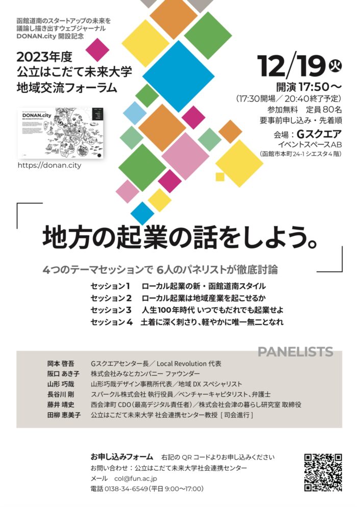 今年度のフォーラムでは、地方の起業の「今」について、函館道南をはじめ他地域・全国・海外の動向にも目を向けながら、多様な論客が語り合います。