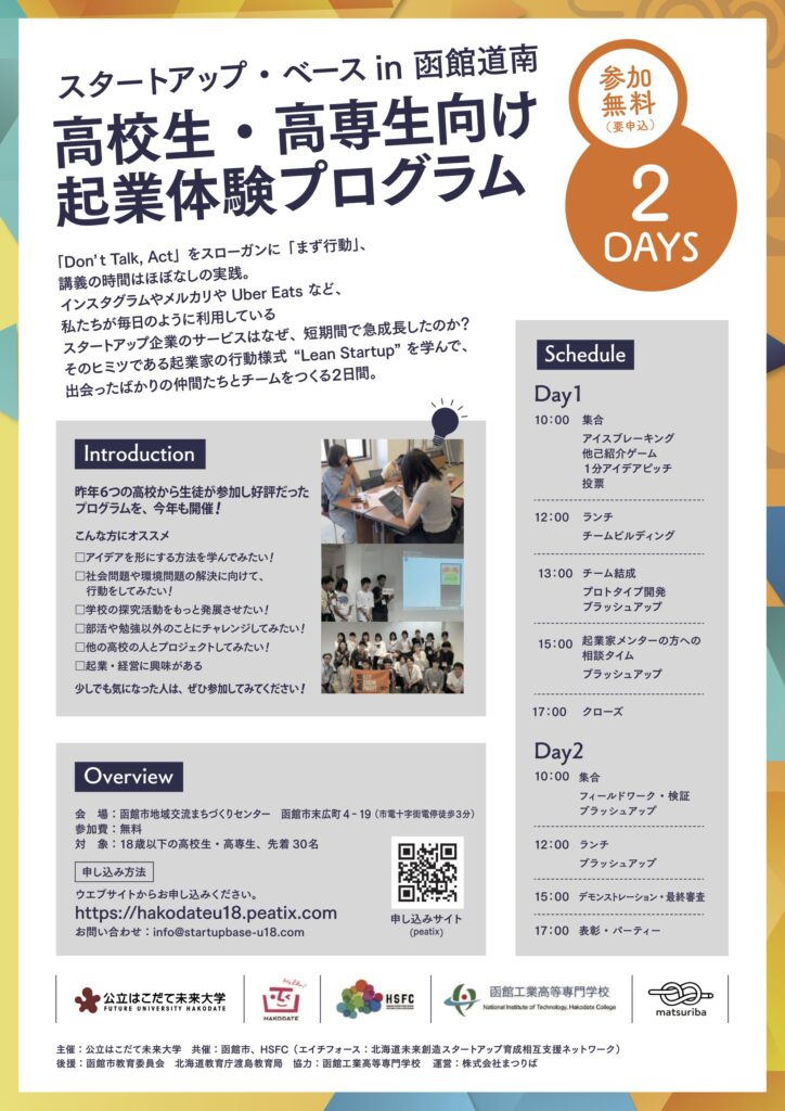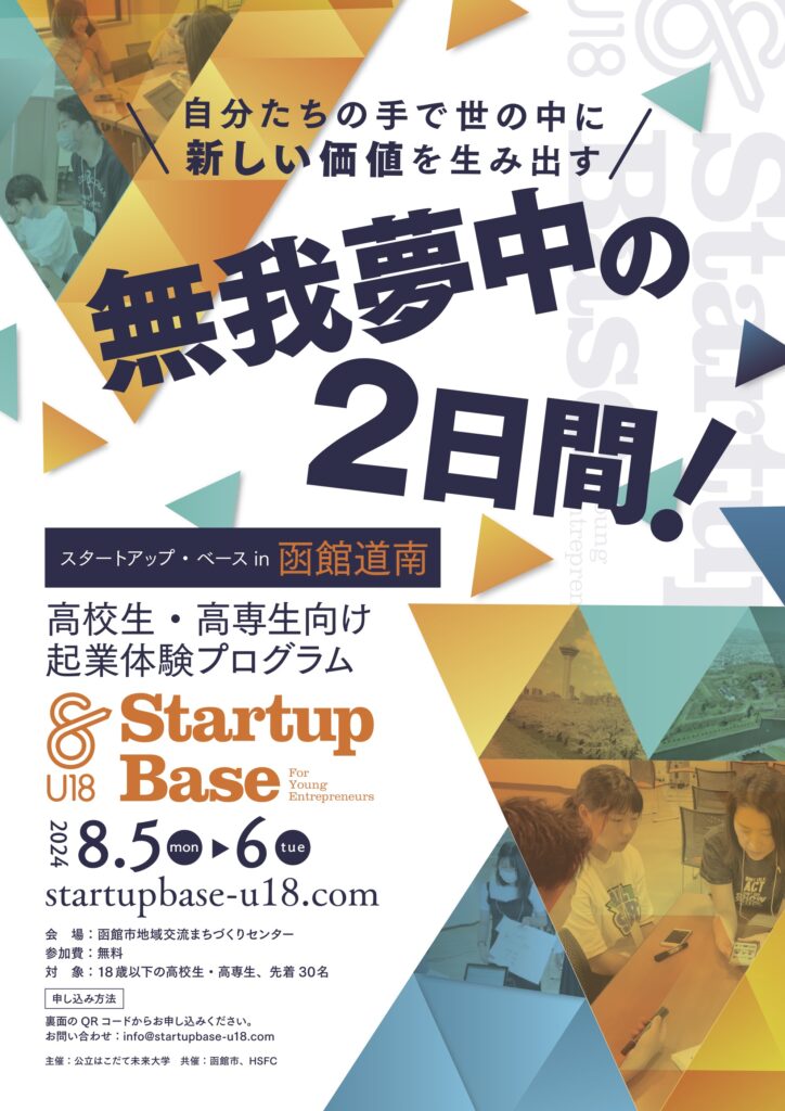 本学主催による「高校生・高専生向け起業体験プログラム Startup Base U18 in 函館道南」を8/5〜8/6の2日間で実施します。