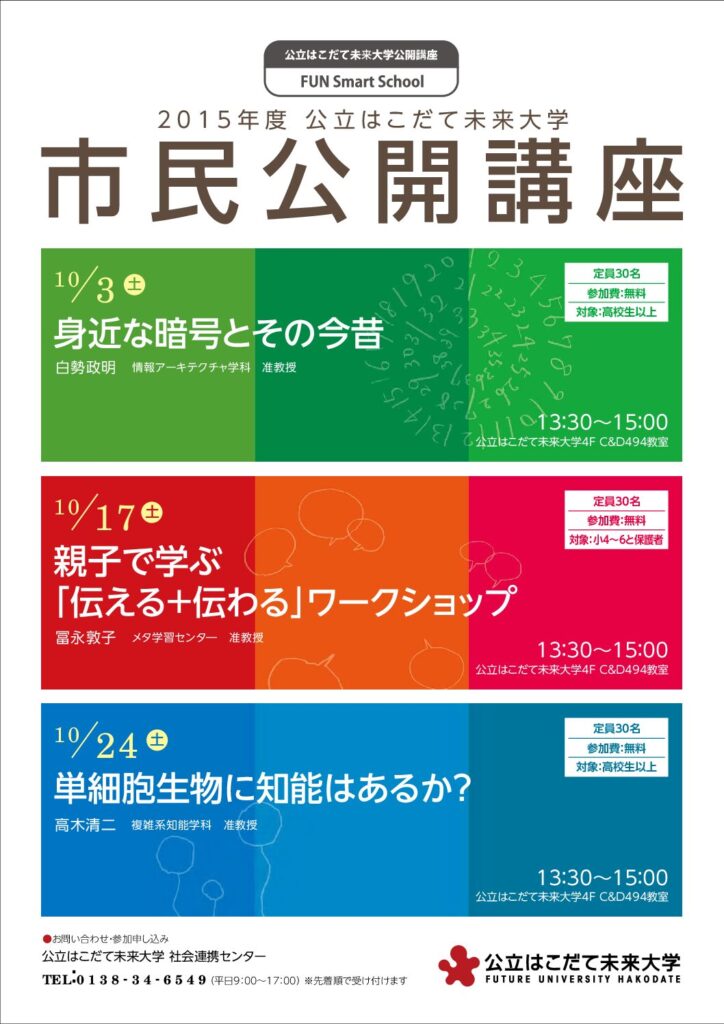 | 会場 | 公立はこだて未来大学4F C&D494教室(函館市亀田中野町116-2) |