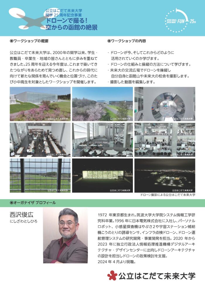 | 対象 | 小・中・高等学校で学ぶロボットやドローンに関心がある学生 函館山や横津岳など函館エリアの壮大な風景をドローンで空撮したい人 近未来的な建築物をドローンで空撮したい人 |