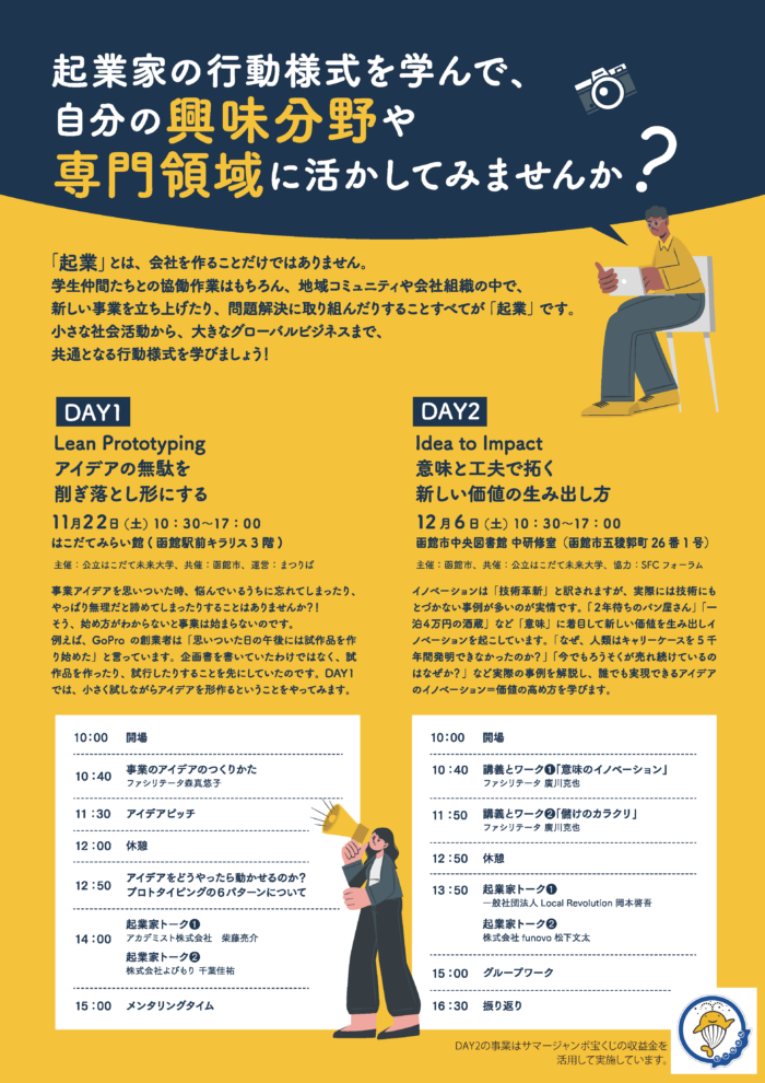 未来大と函館市の共催により、函館市内および道南の学生・院生向けに、起業体験連続ワークショップを11月22日(土)、12月6日(土)の2日間で実施します。