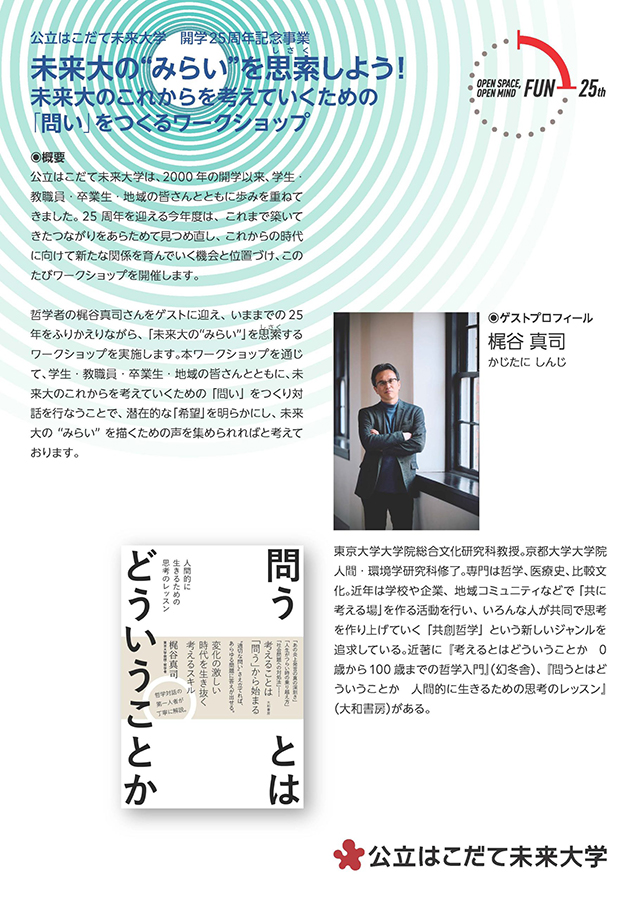 哲学者の梶谷真司さんをゲストに迎え、いままでの25年をふりかえりながら、「未来大の“みらい”」を思索(しさく)するワークショップを実施します。本ワークショップを通じて、学生・教職員・卒業生・地域の皆さんとともに、未来大のこれからを考えていくための「問い」をつくり対話を行なうことで、潜在的な「希望」を明らかにし、未来大の“みらい” を描くための声を集められればと考えております。