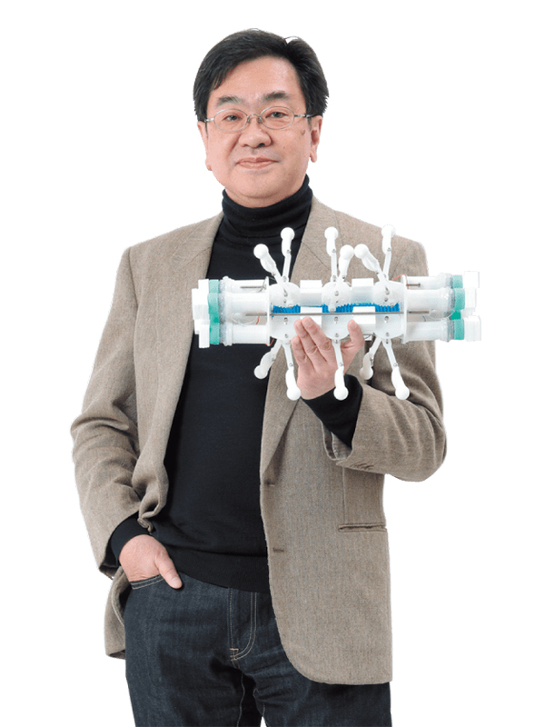 The other example is a passive dynamic walking biped robot that is capable of walking on an outdoor road. The passive dynamic walk is like a sequence of inverted pendulum’s sway and is known as an energy-efficient way but also is very condition-sensitive. My idea is to introduce a self-maintaining stability, like a ship having stability by its bottom shape, into a sole shape so as to produce self-recovery force. Our experimental robot has broken the previous Guinness World Record (13 hours) of non-stop walking by passive dynamic robot by 100 hours.