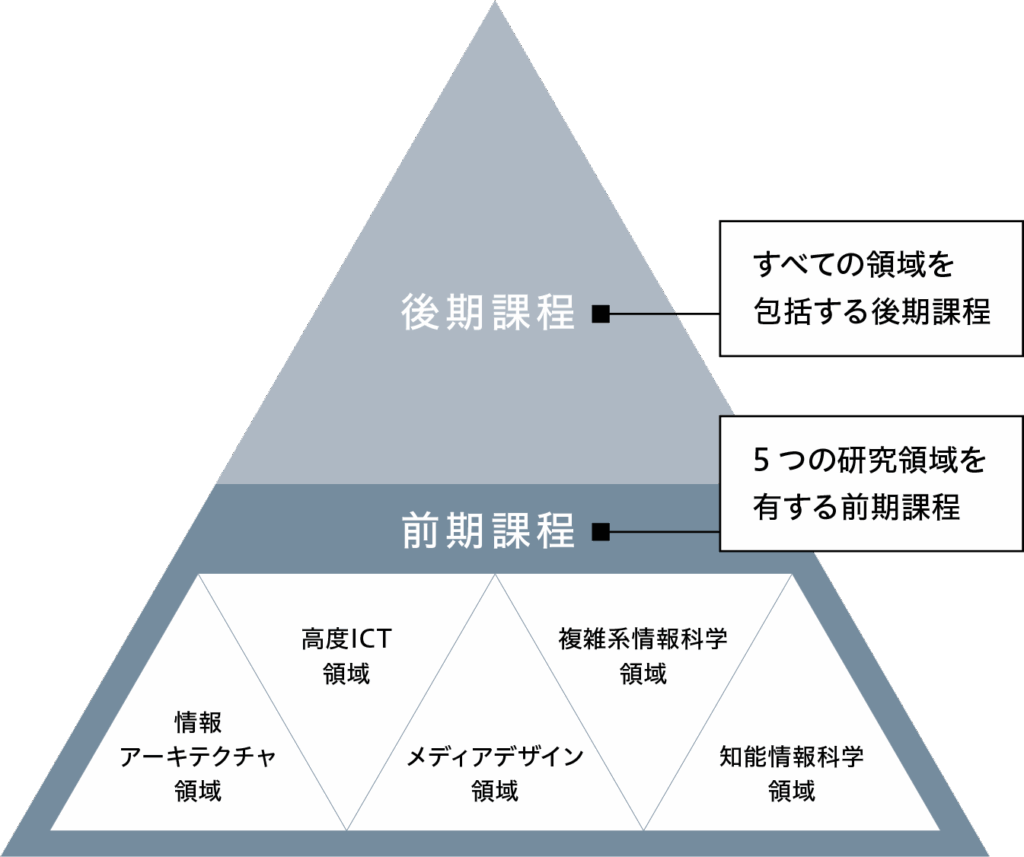 5つの研究領域とその学際領域を基盤に、サービス構築のための高度な知識と技術を磨く博士(前期)課程(2年)と、すべての領域を包括しながら研究者としての専門性を高める博士(後期)課程(3年)を設けています。