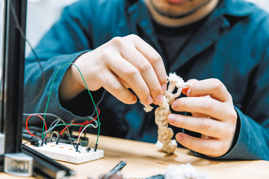 取り組んでいるのは、電気を通す性質を持った「導電糸」や、外部からの刺数によって色が変化する「クロミック糸」といった特殊な糸を用いた、カスタマイズ可能な組紐型デバイスの製作です。これらの特殊な糸を使用したデバイスはすでにありますが、日本伝統の工芸品である組紐をヒントに数種類の糸を編むことで、1本のデバイスに複数種類の入出力機能を付与させるのが私の研究の独自性です。導電糸とクロミック糸の組み合わせにより、通電時や、結んだり引っ張ったりという物理的な刺激で色が変わるデバイスが実現すれば、感覚的な操作が可能になります。見た目はただの紐なのに入カや出力ができるデバイスは単純に面白いし、新たなIT体験のツールになるでしょう。