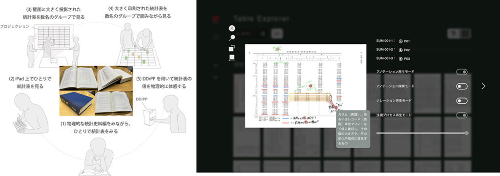 本研究では、函館市史に収録された歴史的統計資料をデジタル化し、市民がデータを読み解きながら発見や疑問を書き込み、それらを手がかりとして新たな解釈が生まれていく共創的なデータ活用環境「Stats.Hakodate」を開発しています。統計資料を題材とした多様なワークショップをデザインして実践し、参加者が生み出したアノテーションや発見をStats.Hakodateに蓄積しています。さらに、生成AIを活用して市民の解釈活動を支援し、人とAIが共にデータを読み解く新しい共創の可能性に取り組んでいます。こうした取り組みを通して、市民参加による新しいデジタルアーカイブ活用の可能性を探究しています。