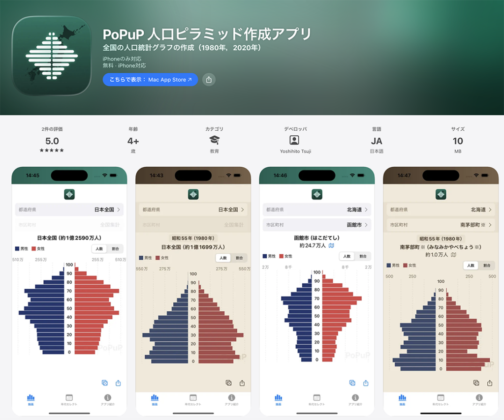 - iPhoneアプリ「人口ピラミッド作成アプリ:PoPuP」(App Store公開中)https://x.gd/94Amr